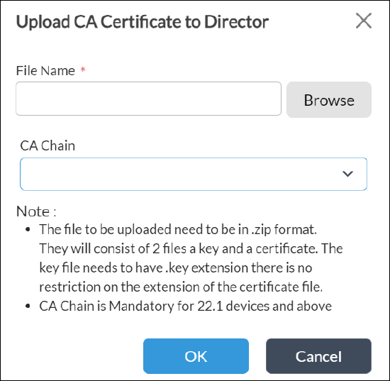 Field Description Chain Name (Required) Enter a name for the CA chain. Chain Filename (Required) Click Browse to select the chain file to upload to the Director node. The chain file must be in .cer, .crt, or .pem format. - Click OK to upload the file.