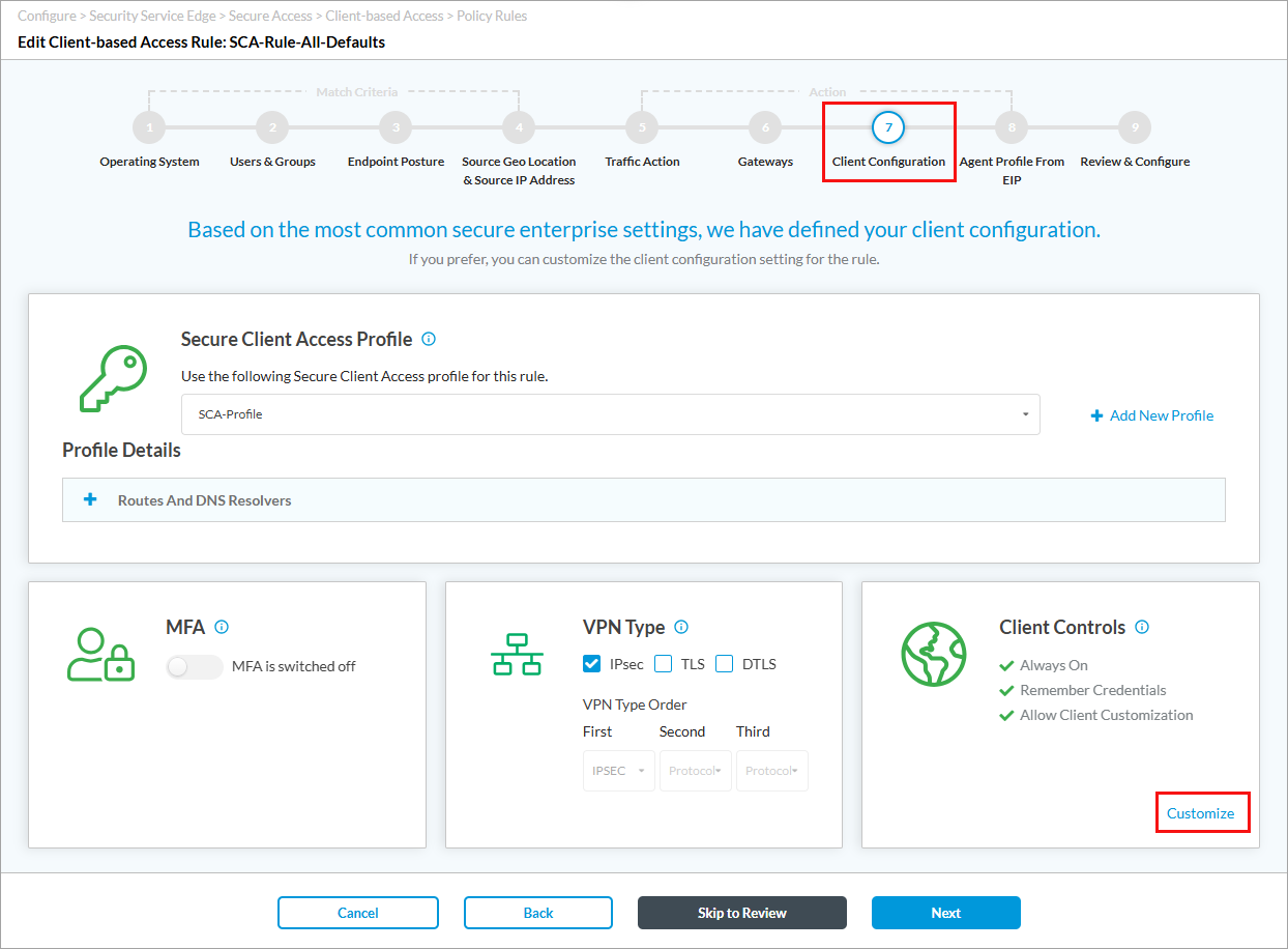 - In the Edit Secure Client Access Rule screen, select step 7, Client Configuration.